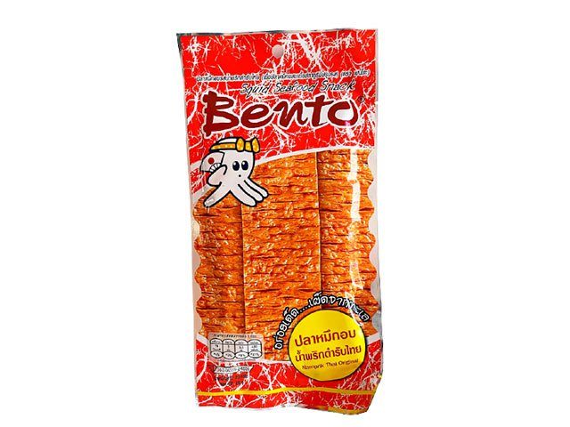Bento är en populär thailändsk snacks som har det hemliga receptet på sin unika kryddiga smak och krispiga textur. Dess spröda inslag av original bläckfisk, örtiga toner och thailändsk chilipasta skapar en unik upplevelse med en spets av kryddighet följt av en söt smak.