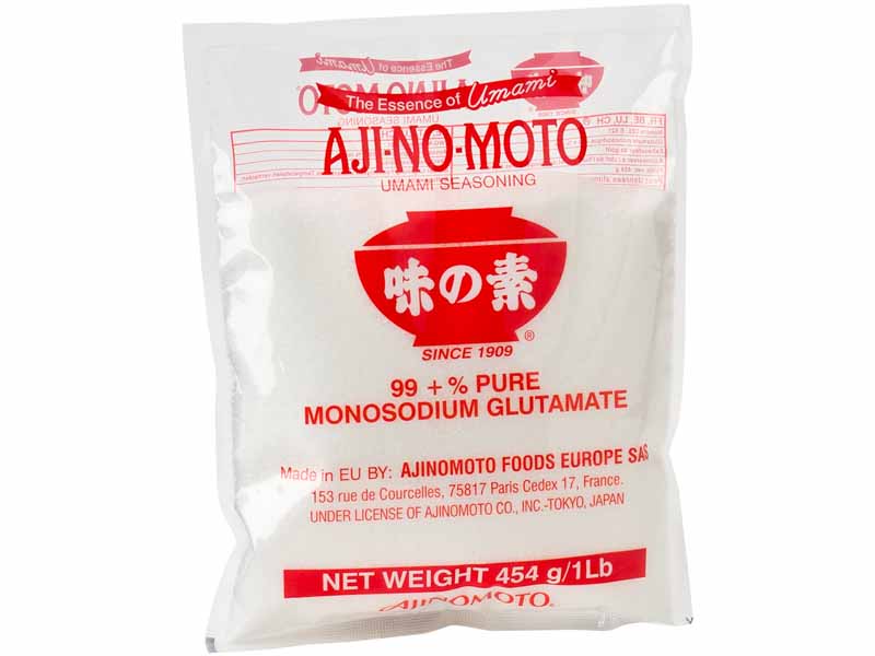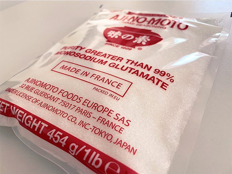 MSG, eller monosodiumglutamat på svenska, är ett natriumsalt av aminosyran glutaminsyra. Detta MSG umamikryddpulver marknadsförs globalt under varumärket Ajinomoto och tillverkas i Frankrike.