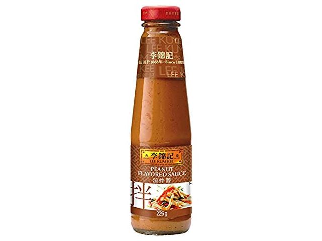 Vatten, socker, JORDNÖTSSMÖR 14%, SOJASÅS (vatten, salt, SOJABÖNOR, VETEMJÖL), risvinäger 9%, SESAMOLJA, chilipulver, vitlökspulver, salt, modifierad majsstärkelse, syra: E260, stabiliseringsmedel: E415 (SOJABÖNOR, VETE), emulgeringsmedel: E471.