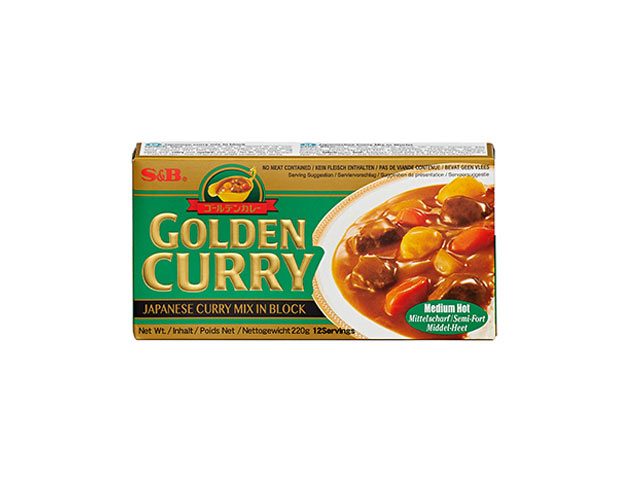 En block Golden Curry Sauce Mix består av currypulver, mjöl och kryddor som förvandlar din gryta till en fin curryrätt genom att bara tillsätta kryddblandningen. S&B Golden Curry Sauce Mix innehåller inga kött- eller köttbaserade ingredienser.