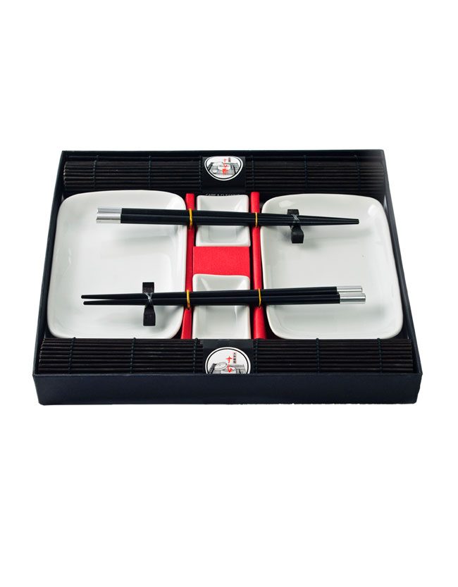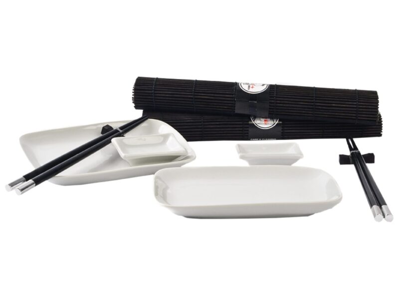 Setet innehåller 2 bambumattor, 2 japanskinspirerade sushitallrikar, 2 matchande dippskålar och 2 par ätpinnar med hållare. Allt som allt ett riktigt läckert serveringsset som får din sushi och japanska rätter att smaka ännu bättre.